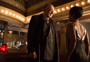 Penguin was late because of the conclusion of the first two-parter in GOTHAM in the ending of the Jack Gruber storyline and Gordon’s return to the Gotham PD. Of course, in the previous episode during his time as an officer at Arkham Asylum, Gordon was tracking a case of someone using electricity to torture some of the inmates there and then use them to his bidding. It was Gruber who escaped after a mass riot. Gruber is now loose in Gotham and terrorizing those that did him wrong before he was arrested. One of these people just happens to be Maroni (David Zayas) and he attacks him getting Penguin caught in the mess (where he spills the beans about having a meet with Falcone to Maroni, which no doubt will come back to haunt him at some point).