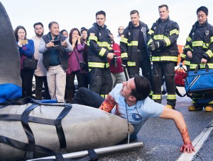 TIM MINEAR: A lot of our cases are real. In fact, the ones that probably you think, “Well, that never happened” are probably the ones that did happen. Even all the way back to the pilot, a [live] baby being flushed down some plumbing, that was a real thing. A bouncy house flying a hundred feet into the air, that was a real thing. So we look to stories from real life. We originally started looking to YouTube a lot, because the whole feeling, our sort of aesthetic for the show is, it’s not a plotty procedural. There are incidents, and we want it to feel like the experience of getting onto YouTube and watching a compilation of ultimate fails. You keep clicking and going down that rabbit hole, because you want to see the next cool thing. So that’s the experience that we’re creating for network television on a scaffolding of amazing, emotional character stories.