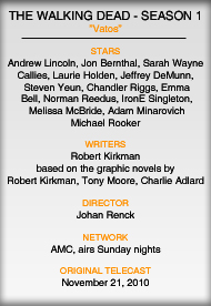 In the latest episode of AMC’s great new zombie series THE WALKING DEAD, Rick (Andrew Lincoln) takes a team back to the city to check on Merle and retrieve that desperately-needed bag of guns while the rest of the camp reacts to Jim’s strange grave-digging behavior. Has the man become a prophet, dreaming of death amongst the survivors, and if so, who in their little party will suffer a horrible fate before the day is out? And is Rick really just like a certain whip-wielding archaeologist, incomplete without his trusty hat?