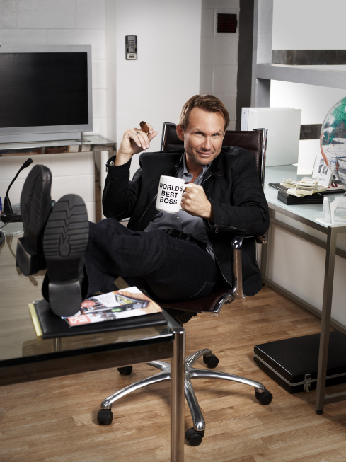 BREAKING IN concerns Contra Security, a firm that is hired to test various security systems by performing the title action. Created and executive-produced by Adam F. Goldberg and Seth Gordon, the new Wednesday night half-hour comedy on Fox features a troupe of deft comedic young actors as the Contra employees. Christian Slater plays their somewhat mysterious and prankish boss, Oz, who likes to surround himself with eclectic objects – for instance, Captain Kirk’s command chair from the bridge of the Enterprise. Slater