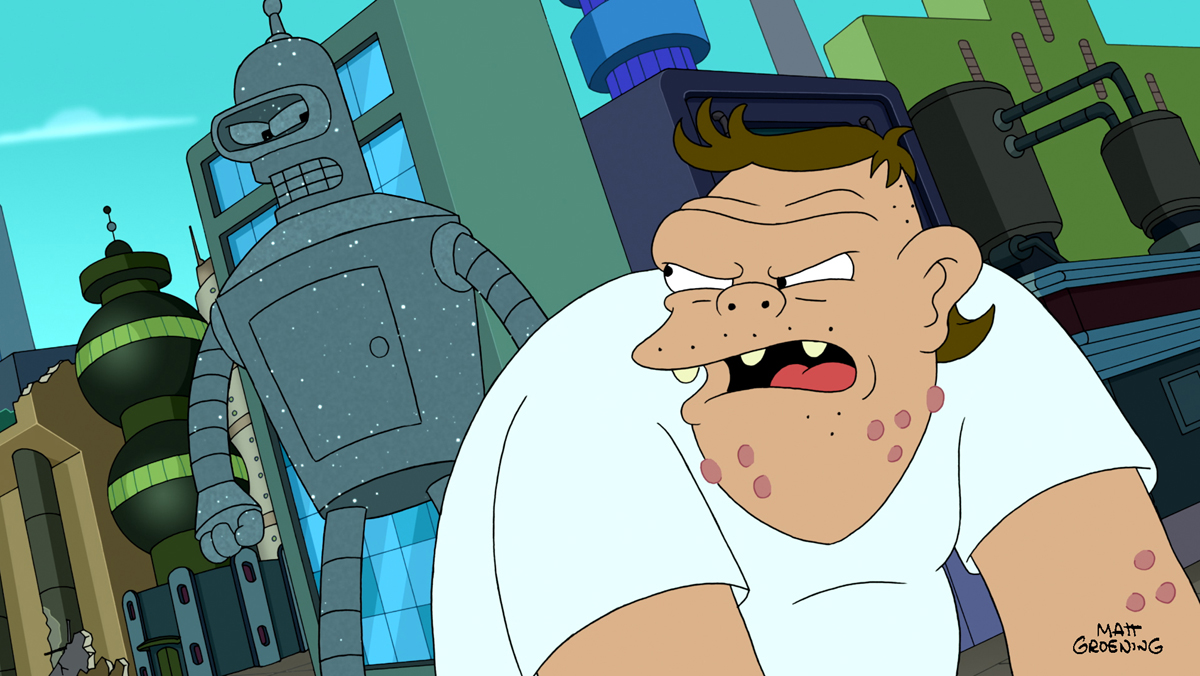 The second one, is called “Benderama,” so you won’t be surprised to hear there’s a lot of Bender in this episode and a lot of Benders, because Bender acquires the ability to self-replicate. He reproduces infinitely generation after generation of smaller and smaller Benders. There are armies and armies of these small Benders. There’s a danger that as they keep reproducing, they’re going to start eating up all the matter on Earth and destroy all of Earth in their need for more and more matter to create more Benders. Meanwhile, if that wasn’t enough entertainment, people of Earth have managed to aggravate this gigantic alien creature who is Unattractive Giant Monster. We didn’t bother giving him a name and he’s played by comedian Patton Oswalt. He is a creature who is giant and hideously ugly, while at the same time sensitive about his appearance and easily offended and has a temper-control issue. He attacks Earth during this Bender chaos and it’s up to Bender to fend off this unattractive giant. So there’s a lot of action on Night 1 of FUTURAMA …