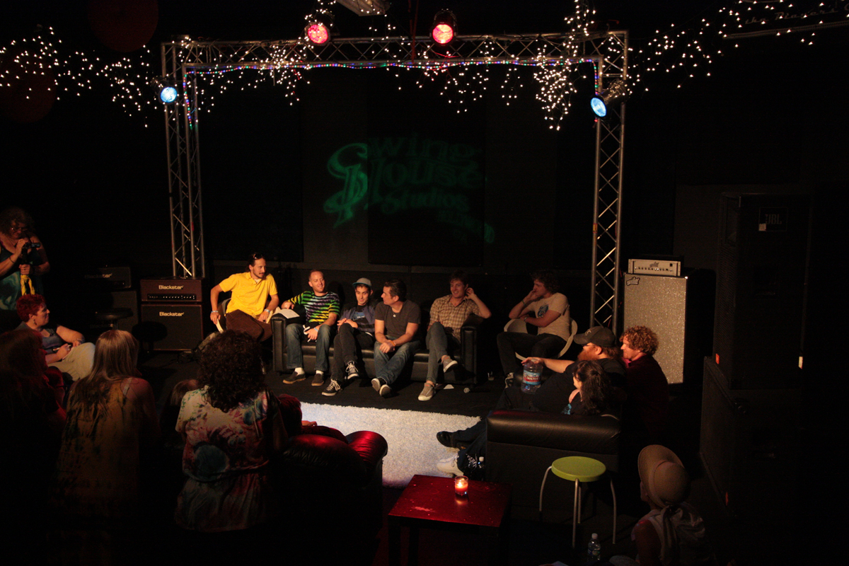 However, original Ghost of the Robot members Marsters, De Mars, McPherson and Anderson – sadly, Sellers passed away in 2009 – got back together for a live performance at their old Santa Monica stomping grounds the Central Social Aid & Pleasure Club (formerly 14 Below) in 2010, joined by Marsters’ then fourteen/now-fifteen-year-old son Sullivan. This kicked off a California tour. Subsequently, Anderson moved out of state, so De Mars recruited Jordan Latham to play drums on the band’s new album MURPHY’S LAW, which just debuted on iTunes. A CD edition, plus more albums and a new tour, are planned for 2012. At a listening party for MURPHY’S LAW in Los Angeles, the Ghost of the Robot membership, plus MURPHY’S LAW vocalist Micah Biagi, talk about the band’s new incarnation.