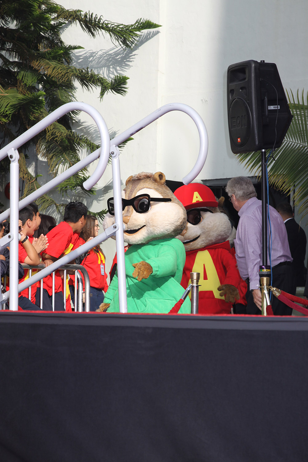 It was such a fun day! Alvin, Simon and Theodore walked out from the theatre to be greeted by 300 children from the Hollenbeck Middle School all dressed in Alvin t-shirts, plus fans and all the press.