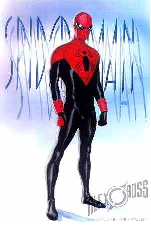 This was a dismissed design by the spectacular airbrush artist Alex Ross. Ross again played with the web pattern vs. (in this case) black make-up of the suit. Note Spidey did have webshooters in this version, and even though this wasn’t used it does seem to be a bit of an inspiration again in the new movie costume.