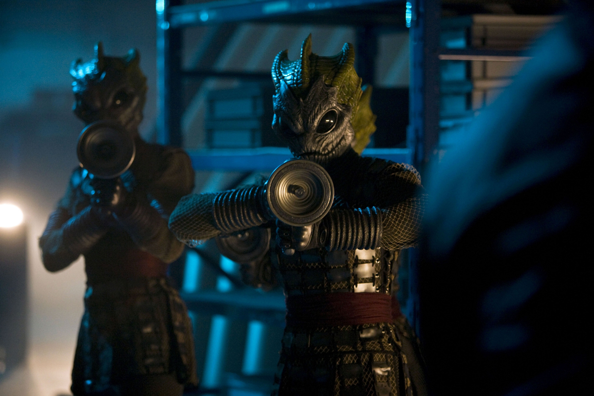 We’re also given no emotional context for the army the Doctor gathers to help him since most of them are characters we’ve never even met before or only briefly. The soldier that once met him (Christina Chong) seems sweet, Dan Starkey’s Sontaran nurse is great fun, and fandom in general instantly took to the samurai sword-wielding Victorian Silurian lesbian detective (Neve McIntosh) and her sidekick/lover (Catrin Stewart). That’s not surprising; put a weapon in a female character’s hand, and she’ll have a fan club and several thousand pages of fanfic posted about her within an hour of her debut. But they aren’t characters, just a collection of attributes with cool costumes.
