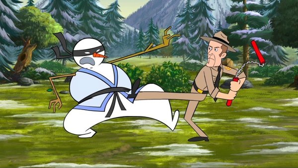 And not just any animation. While Kevin, Jenna and Zoe, protected by Sarah’s force field, remain blissfully unaware of what’s going on in the rest of Eureka, the residents cycle through turning into videogame CGI, Charlie Brown, Matt Groening and SOUTH PARK-style identities before settling into Rankin-Bass Claymation. Jack’s police jeep can suddenly talk (voiced by guest Jim Parsons), Australian scientist Taggert (Matt Frewer) is a polar bear, Jo (Erica Cerra) is in princess garb that she hates, and a giant snow ninja is terrorizing the town. The only solution is one more style of animation.