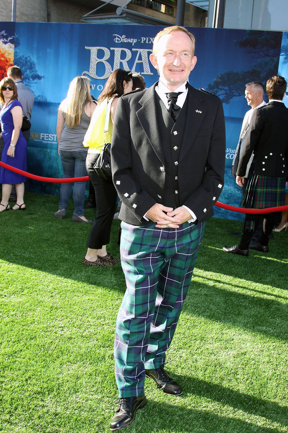 Everything was green like the hills of Scotland! The Director, Mark Andrews showed up wearing a kilt. Bag Pipers came down the carpet playing, which was really cool! Fans lined the street. Red curly wigs were handed out to a few photographers who posed with Kelly Macdonald (I was one, but sorry no picture). Kevin Nealon wore one of the wigs as he walked the carpet. It was a fun premiere!