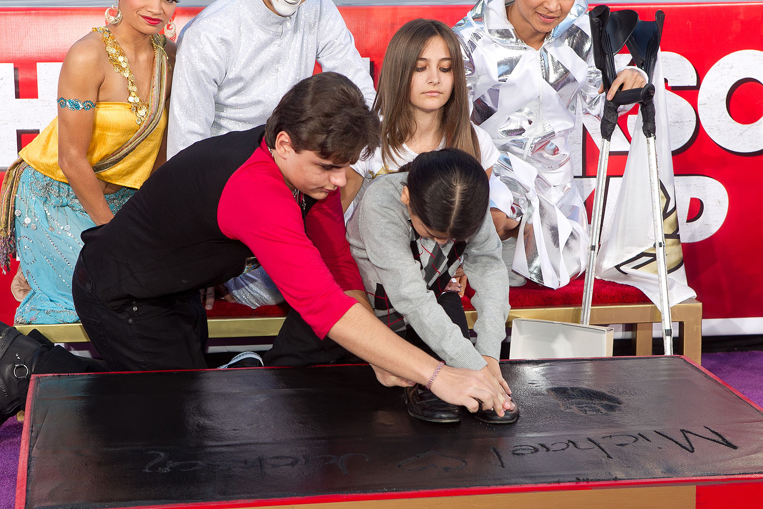 Michael Jackson’s three children, Prince, Paris and Blanket used their father’s sequined glove and shoes to make impressions in the cement, and Paris signed Michael’s name, with a heart in the cement, and then adding their own handprints by the shoe imprint.