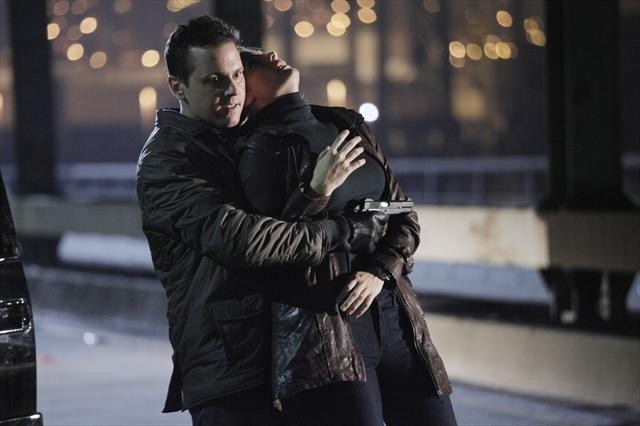 Perfect time for Tyson to slam his SUV into Beckett’s car and start firing, which they just barely escape. Beckett is really angry now, and that’s never a good thing, and she unloads into Tyson, only he’s wearing a bullet-proof vest and captures her, scattering her gun. He goes after Castle, not realizing that Castle has escaped the car. Castle pops up, unloading the gun again (not sure where all the ammo has come from – I think most automatics only fire 7 or 8 shots per clip), but this time knocking Tyson off the bridge.