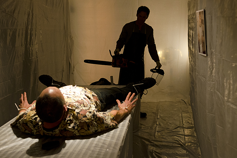 Meanwhile, Hector Estrada, one of the men who murdered Dexter’s mother in front of him when Dex was a child of three, is being paroled. Dexter tricks Hector into meeting him alone at night in a shipping container lot. However, when Dexter gets Hector on his table, Hector starts yelling about how this is a set-up with “that woman” – the police captain who was so eager for Hector to get out of jail. Dexter realizes that LaGuerta has set up a trap for him. He yanks the still-alive and well Hector out of the shipping container with him. Hector escapes Dexter and jumps off the dock. Dexter hides as LaGuerta and an officer find the shipping container with its insides swathed in plastic sheeting and a running chainsaw, but nothing else.