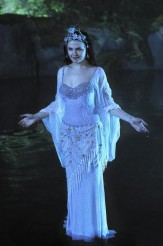 Back in fairy tale land, James and Abigail confront each other – turns out that not only is Abigail onto James’ love for Snow White, she’s got a love of her own. Only he’s a gold statue because he bumped up against Midas while trying to protect them. James offers to go after water from the magic lake, in spite of the fact that no one has ever gotten away from there alive. Sure enough, there’s an evil shape changing being in there who tries to suck James under by changing into Snow White’s shape.