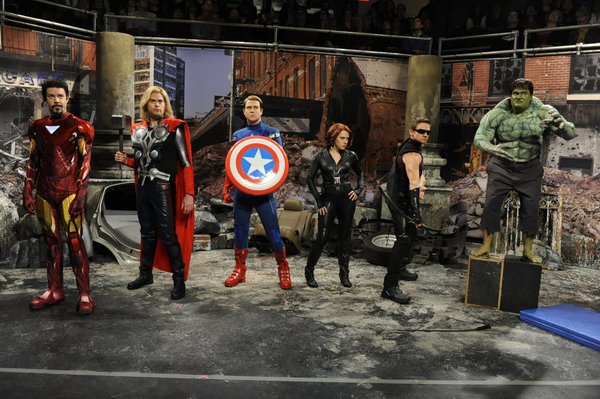Jason Sudeikis, Bill Hader, Taran Killam, Kate McKinnon, host Jeremy Renner, Bobby Moynihan in an AVENGERS parody on SATURDAY NIGHT LIVE - Season 38 | ©2012 NBC/Dana Edelson