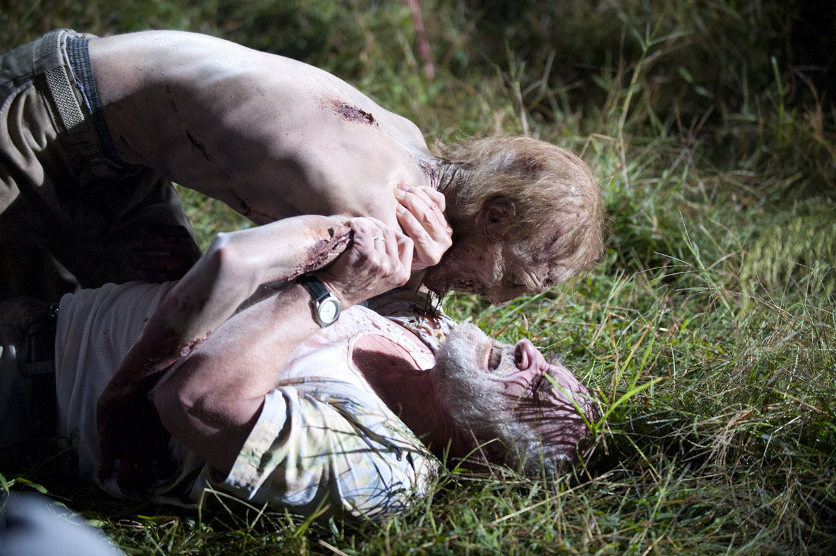 Religion gets a look in via Hershel’s (Scott Wilson) acknowledgement that he was wrong, while Carol (Melissa Suzanne McBride) bristles at cold Carl’s (Chandler Riggs) rejection of her faith. Carl is a child of the new world, and he winds up motivating much of what happens in the episode’s finale. In the “stupid move” sweepstakes, he taunts a temporarily trapped zombie for no reason whatsoever, freeing the very creature that will later tear Dale to pieces. It makes no sense, unless we assume Carl has a death wish. When the terrible incident takes place, Carl immediately recognizes the monster responsible, so his sense of guilt may be something to watch in the next couple weeks and beyond. As for the death itself – why exactly was Dale patrolling alone in the dark?