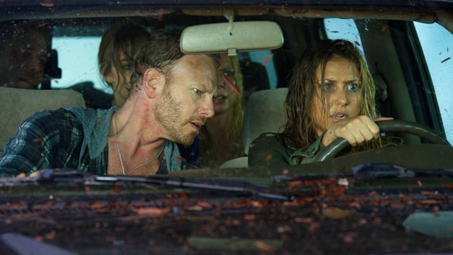 - Ian Ziering, Cassie Scerbo and Tara Reid (in back seat) in SHARKNADO | ©2013 Syfy