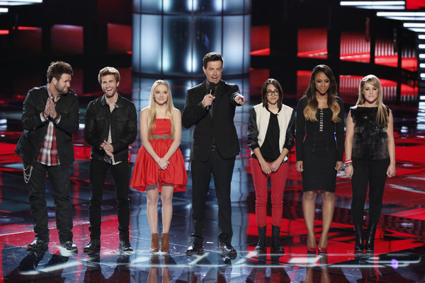 Zach Swon, Colton Swon of The Swon Brothers, Danielle Bradbery, Carson Daly, Michelle Chamuel, Sasha Allen, Amber Carrington on THE VOICE - Season 4 - "Final 5 Live Elimination Show" | ©2013 NBC/Tyler Golden
