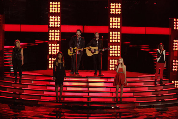 Amber Carrington, Sasha Allen, Zach Swon, Colton Swon of The Swon Brothers, Danielle Bradbery, Michelle Chamuel performs on THE VOICE - Season 4 - "Final 5 Live Elimination Show" | ©2013 NBC/Tyler Golden