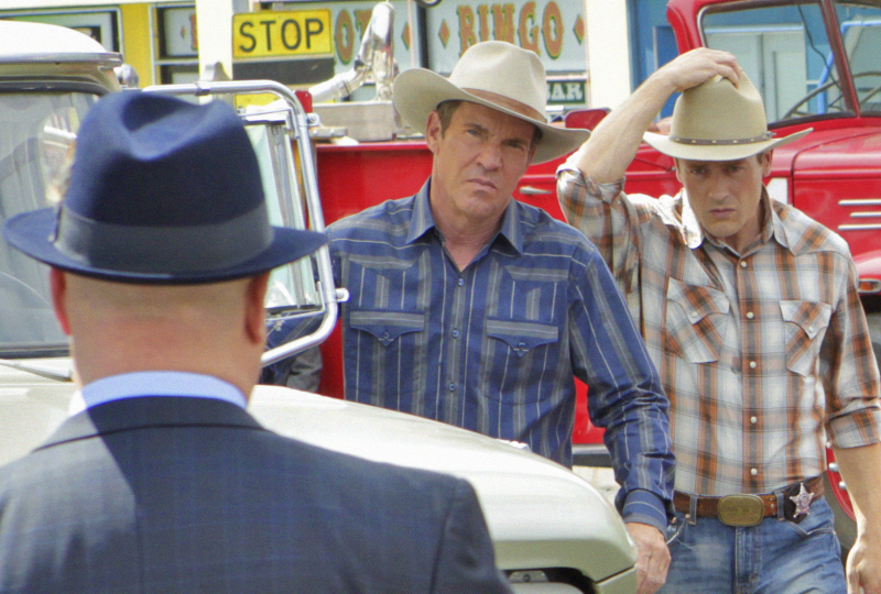 In VEGAS, Dennis Quaid plays farmer-turned-Las Vegas sheriff Ralph Lamb, who has to team up with casino owner/gangster Vincent Savino, played by Michael Chiklis, in the first-season finale, CBS, Friday May 10 at 9 PM.