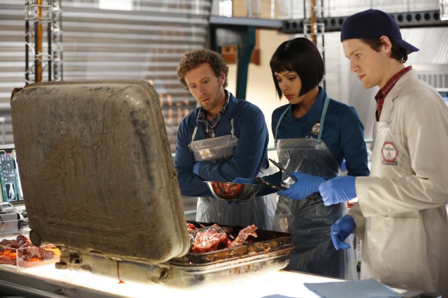 Hodgins (TJ Thyne), Cam (Tamara Taylor) and Jeffersonian intern Finn Abernathy (guest star Luke Kleintank) investigate remains found in a suitcase in the upcoming BONES episode "The Friend in Need" | (c) 2013 John Johnson/FOX