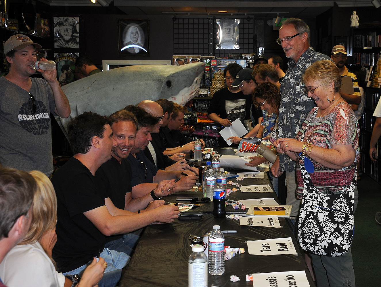 The SHARKNADO cast and creators (and the Shark) took over Dark Delicacies Bookstore in Burbank on September 8th for a DVD signing release for the SyFy Channel’s hit movie. Signing was Director Anthony C. Ferrante, Writer Thunder Levin. Joining them were stars: Tara Reid, Ian Ziering, Cassie Scerbo, Jaason Simmons, John Heard, and Robbie Rist. Plus, Producer – David Michael Latt, Synapse FX’s Joe Cornell and Josh Foster, Film Editor – William Boodell, and Visual Effects Supervisor – Emile Edwin Smith.