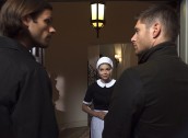 We see, or think we see, Bunny’s ghost kill a maid who tries to steal her pearls; later, we see the ghost of Bunny’s husband decapitate another family member who besmirches Bunny’s name. The butler Philip (Kevin McNulty) is apparently in cahoots with the ghosts – but then he’s found murdered. Sam and Dean realize they’re actually dealing with a shape-shifter who is pretending to be ghosts. The shape-shifter turns out to be the surviving housemaid Olivia (Izabella Miko), who is actually the daughter of the late Bunny and a shape-shifter. Bobby killed Olivia’s real father; he allowed Bunny to keep her daughter on the condition that Olivia remain locked up in the attic. Philip let Olivia out, but by then she’d gone bonkers. Sam tries to reason with her, Olivia won’t listen and Dean shoots her. After she’s dead, Dean shoots Olivia’s corpse some more. This causes Sam to worry that his brother may not yet be over his demon phase, even though Dean insists he’s fine.