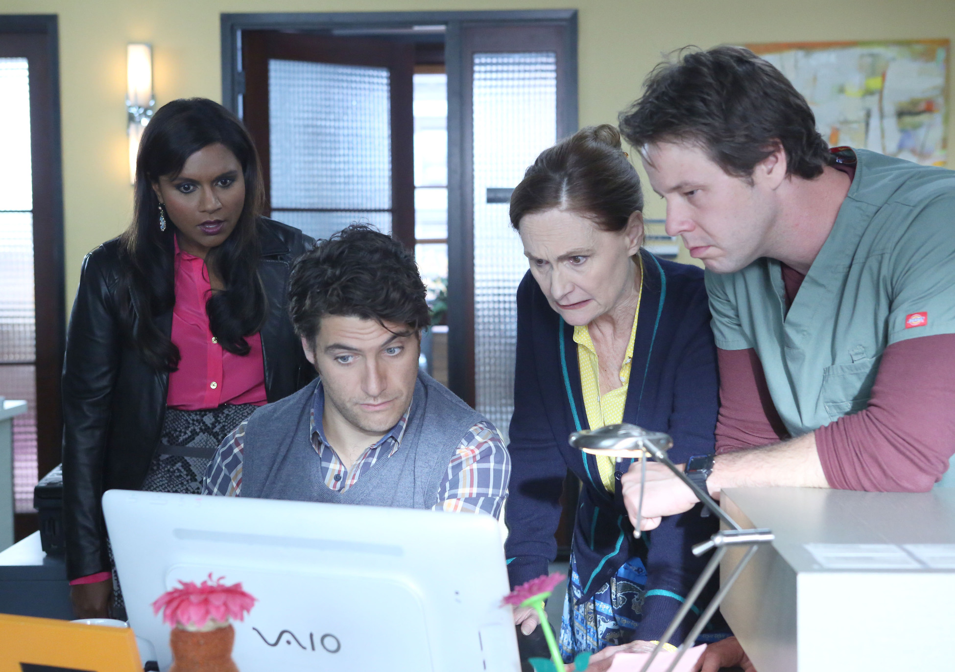 Mindy Kaling, Adam Pally, Beth Grant and Ike Barinholtz in THE MINDY PROJECT - Season 3 - "How to Lose a Mom in Ten Days" | © 2014 Fox/Beth Dubber
