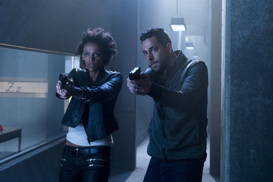 Judith Shekoni as Joanne Collins, Zachary Levi as Luke Collins try to escape in HEROES REBORN | © 2015 Christos Kalohoridis/NBC