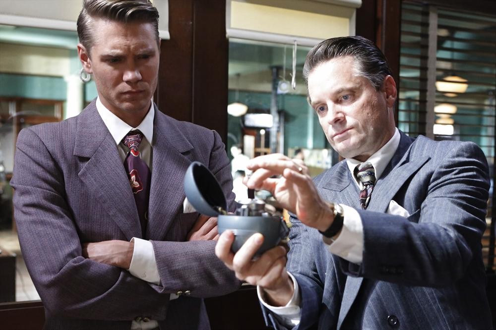 Dooley (Shea Whigham) and Thompson (Chad Michael Murray) examine the blood of Captain America in AGENT CARTER | © 2015 ABC/Kelsey McNeal