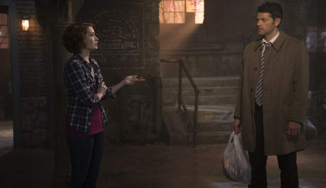 Misha Collins as Castiel and Felicia Day as Charlie in SUPERNATURAL "Dark Dynasty" | © 2015 Katie Yu/The CW
