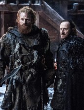 At Castle Black, in the room where Jon Snow’s (Kit Harrington) body lies, Davos (Liam Cunningham) and Jon’s friends prepare to make a last stand against Ser Alliser (Owen Teale) and the Night’s Watch. At the last moment, the Wildlings – including a Giant – led by Tormund (Kristofer Hivju) and Night’s Watch brother Edd (Bren Crompton) knock down the gate. Except for Ser Alliser and Jon’s former steward Olly (Brenock O’Connor), the Watch surrenders promptly. The viewer’s response is likely to be something along the lines of, Go, team. It’s satisfying and looks good (especially when the giant almost absent-mindedly smashes his comparatively tiny attacker against the inner courtyard wall), even if it seems a little restrained by GAME OF THRONES rescue standards.