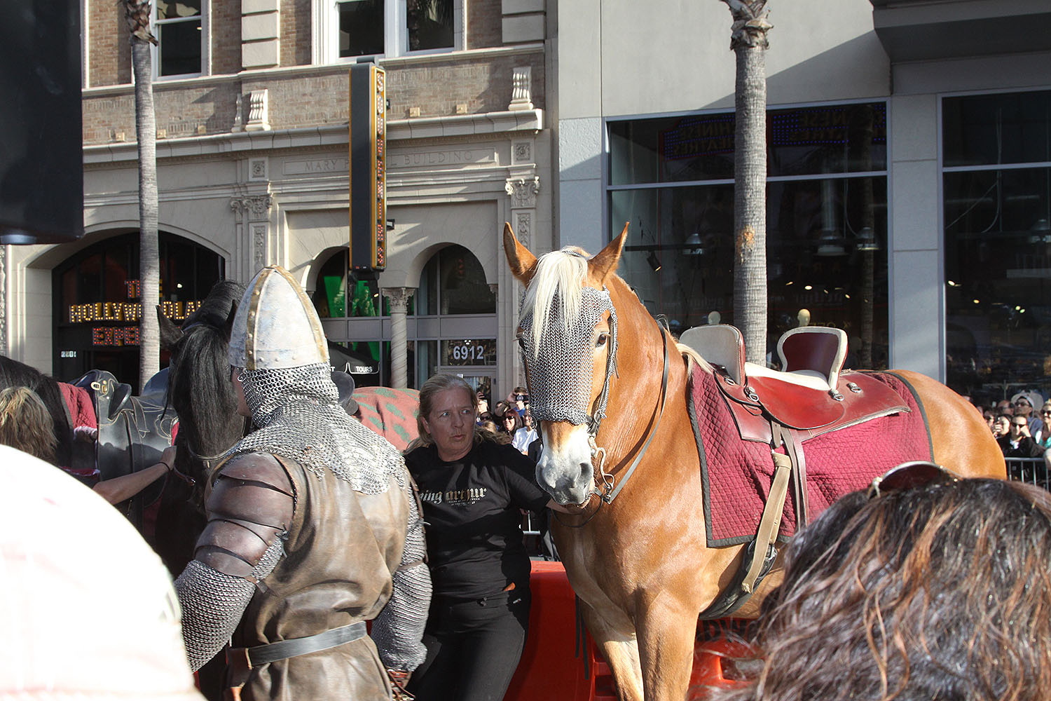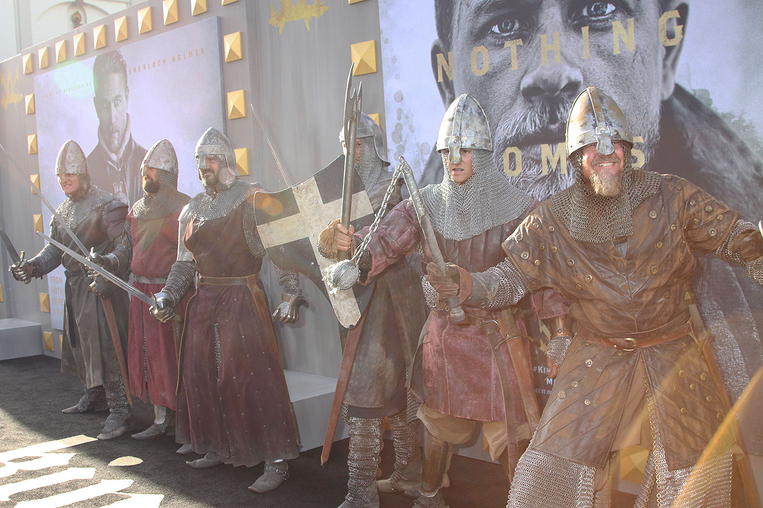 Before the premiere started men dressed in costumes from the age of King Arthur rode horses down the street and then they walked the carpet and each took a place on platforms on the carpet.