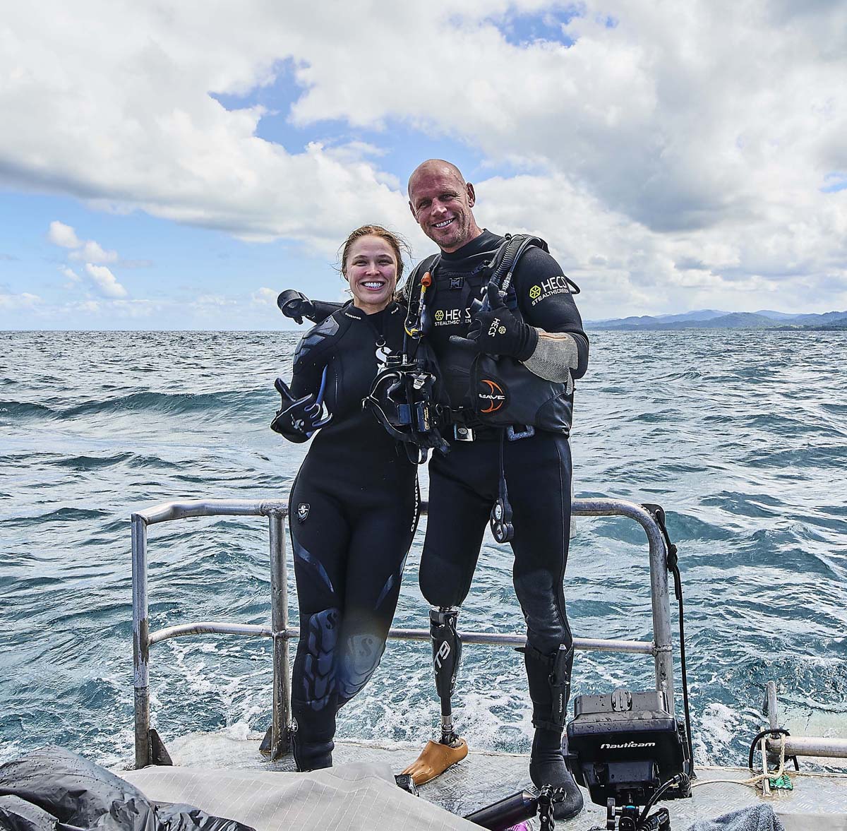 Ronda Rousey and Paul De Gelder pose before their dive beneath the waters off the Fiji coast in RHONDA ROUSEY UNCAGED | ©2018 Discovery Channel