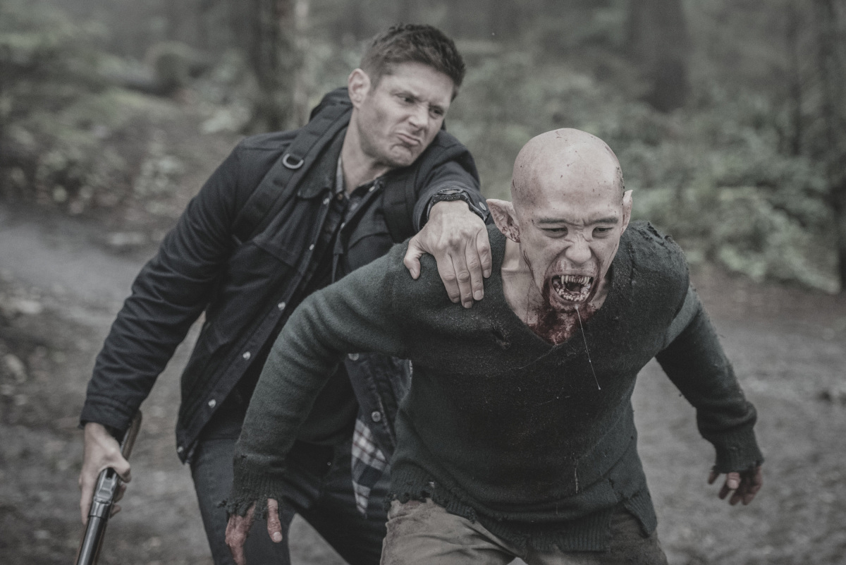 Our heroes come upon a vampire attacking a human man, Floyd (Michael Patric), and a young girl, Maggie (Katherine Taylor). Sam kills the monster. The humans explain they were trying to join Mary and Jack’s group, but the shortest route is through a cave that is inhabited by a nest of vamps. No problem for our monster hunters, or so they think. Inside the cave, the group is attacked. The vamps take out Floyd – and Sam gets bitten in the throat and dragged away. Cass tells Dean they don’t have time to go after him, and that Sam is lost.