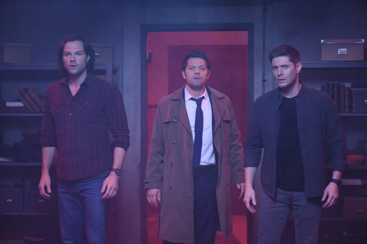 Jared Padalecki as Sam, Misha Collins as Castiel and Jensen Ackles as Dean in SUPERNATURAL – Season 14 – “Jack in the Box”| ©2019 The CW Network, LLC/Diyah Pera