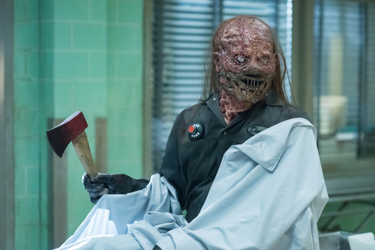 At the hospital, the ALL SAINTS DAY marathon continues on TV. Dean and Dirk bond over their favorite installments in the series. Dean confides to Dirk that he likes watching movies where he knows the bad guy will be defeated. Then Sam calls Dean and tells him the possessed Hatchet Man mannequin is on its way to the hospital. Dean is overjoyed at the chance to square off against his favorite movie monster.