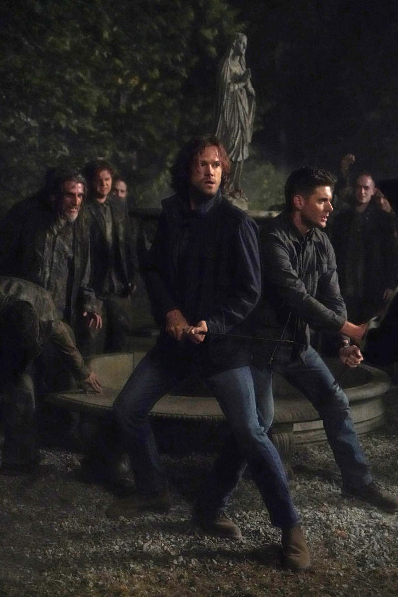 Monsters, monsters everywhere. Sam (Jared Padalecki), Dean (Jensen Ackles) and Castiel (Misha Collins) are fighting everything coming at them in the graveyard, and there’s a lot of everything. Then Castiel spots a possible escape route, grabs the eyeless corpse of Jack (Alexander Calvert) and shouts to Dean and Sam.