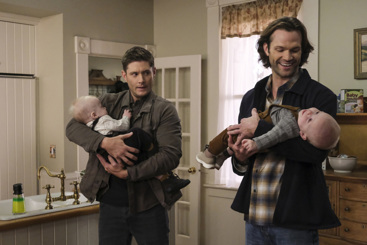 Back at Garth’s home, Dean and Sam cuddle the twins until baby Castiel’s eyes start glowing yellow, signifying that the kid is feeling a little wolfy. The guys hand the tots back to their mommy. Sam and Dean both thank Garth for saving them, and killing a bunch of monsters. He’s a hero. Garth wonders if they’ll be okay, what with being normal and having God after them. Sam says he honestly doesn’t know. Garth says he’s heard a rumor about a place in Alaska where people can go if their luck has turned bad. Then the guys hug Garth.
