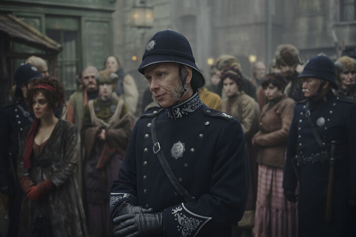 HARRIS: No. I was never hanging anywhere. My character could hardly walk, let alone fly. The chase scene was a lot of fun, but I remember it was brutal weather. It was raining for three nights solid, and you were having to run through cobbled streets, and it felt endless. As always, on camera, the scene looks amazing. You’re chasing us, Jay, in the air, and there’s me and [other police] running away, and it looks fantastic. It also looks rather quick. But actually, it wasn’t. It took days upon days to shoot that. But I was actually quite comfortable in all my scenes.