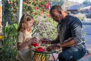 Annabelle teaches Christian Cooper how to make sugar water for the Costa Hummingbird feeders in her front yard in Palm Springs, CA in EXTRAORDINARY BIRDER WITH CHRISTIAN COOPER | ©2023 National Geographic/Jon Kroll