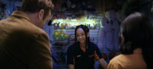 AMARA: Well, first of all, he’s eight feet tall [O’Dowd is 6’3”, Amara is 5’3”], so he gave me a hug, and lifted me into the air, and it felt like the weather was different. So, something about that changed me. It just felt like we were instantly connected after that moment. He did that today [at the earlier Q&A session for THE BIG DOOR PRIZE] as well. He’s just a great guy. We have these different jokes and games that we play on set, like this “Guess the Movie” game, but I’m not going to explain it.