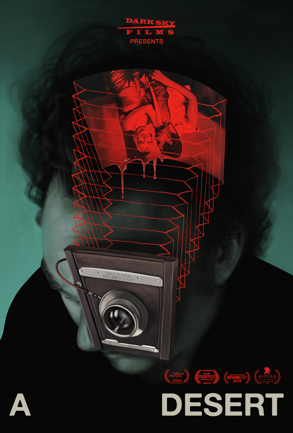 A DESERT is a slow-burn, sun-drenched film noir. We start out following photographer Alex Clark (Kai Lennox) as he travels through California’s Yucca Valley, taking pictures of abandoned housing projects, derelict buildings, and even freight trains with skeletal cars.