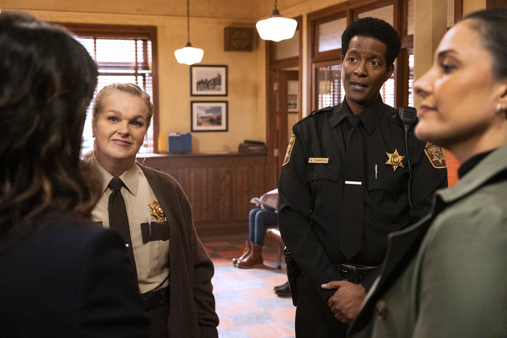 Elizabeth Bowen as Deputy Liv Baker, Corey Reynolds as Sheriff Mike Thompson, Nicola Correia-Damude as Detective Lena Torres in RESIDENT ALIEN – Season 4 – “The Ties That Bind” | ©2025 NBCUniversal / James Dittiger/USA Network