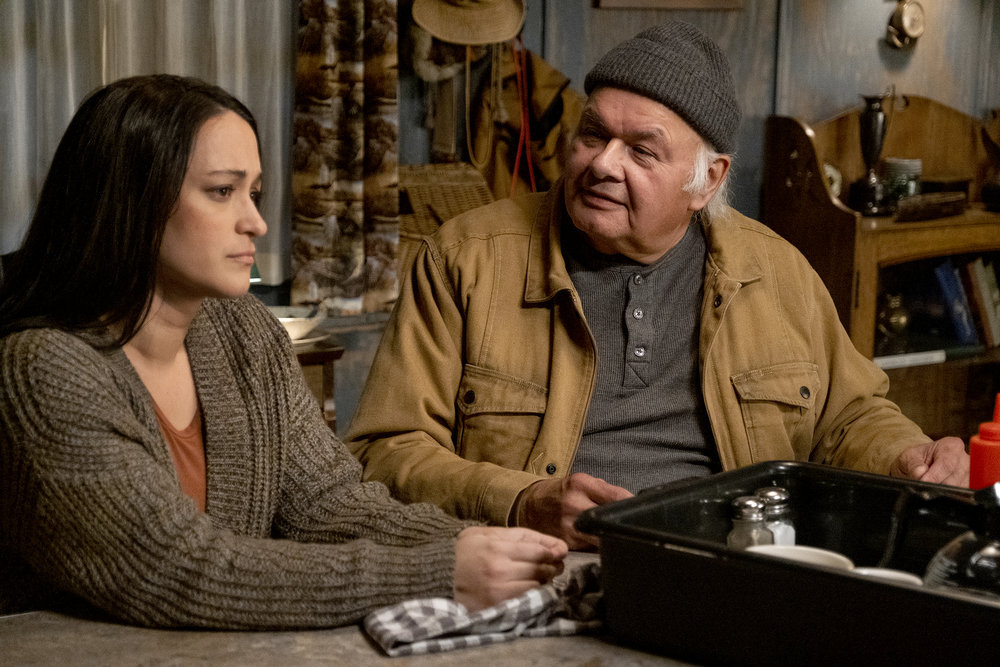 Sara Tomko as Asta Twelvetrees and Gary Farmer as Dan Twelvetrees in RESIDENT ALIEN – Season 3 – “141 Seconds” | ©2024 Syfy/James Dittiger
