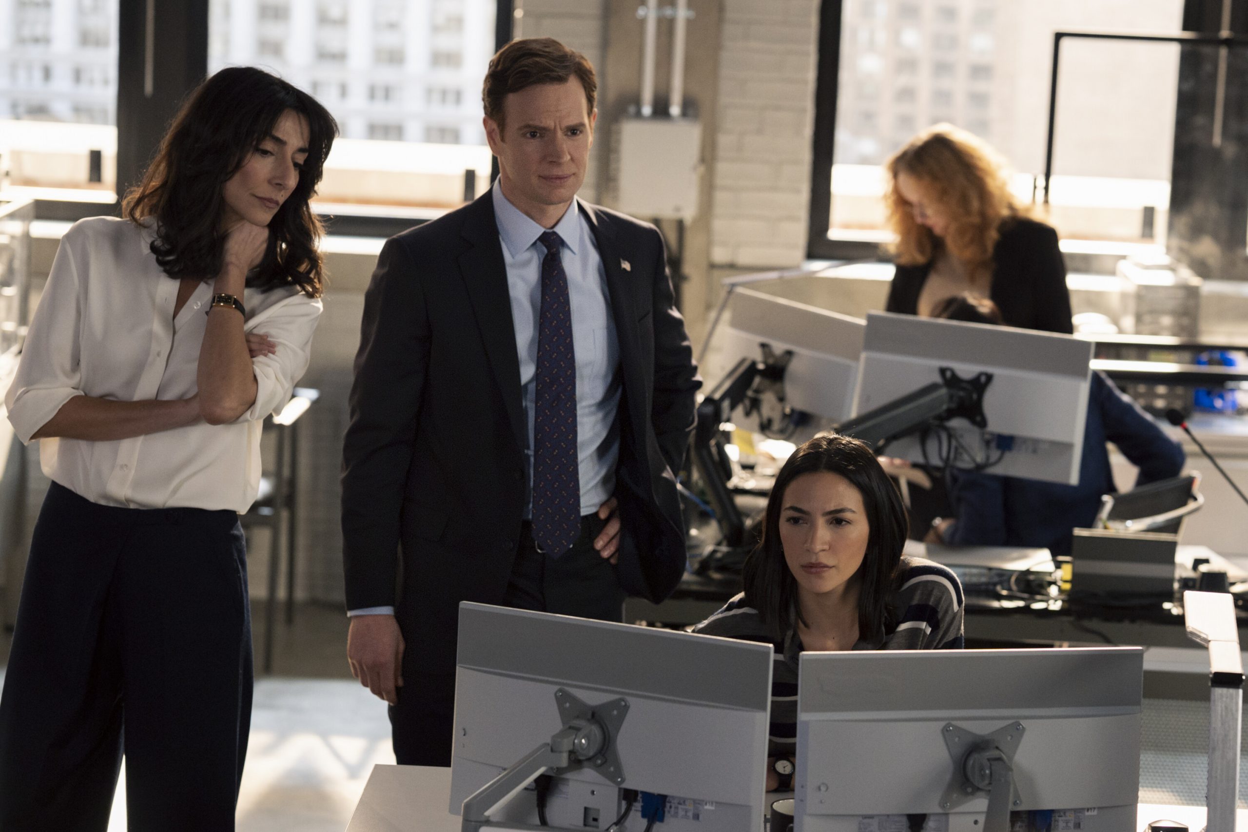 Necar Zadegan as Deputy Chief of Station Nikki Reynard, Nick Gehlfuss as Special Agent Bill Goodman, and Natalee Linez as CIA Analyst Gina Gosian in CIA – Season 1 – “Directed Energy” | ©2026 CBS/Zach Dilgard/